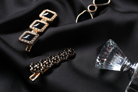 Beautiful hair clips and perfume on black fabric, closeup