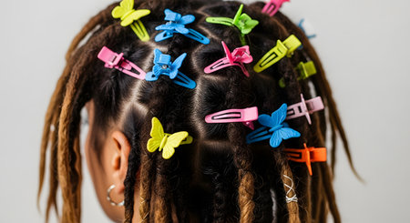 A close-up, rear view of a person's head with dreadlocks sectioned and held in place by numerous colorful, butterfly-shaped plastic hair clips. The hairstyle suggests a fun, youthful, and creative look.