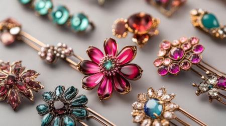 An image of stylish hair clips with jewel tones and elegant designs, arranged to showcase their refined and fashionable appearance.