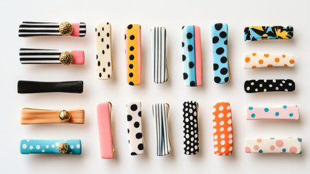 A selection of cute hair clips with various patterns, such as polka dots and stripes, displayed in a neat arrangement on a simple white background.
