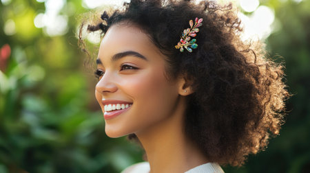 A young woman smiling while wearing a trendy hair clip that complements her outfit, with a focus on the clip's detail and its effect on her hairstyle.