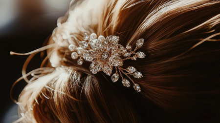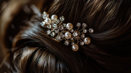 A close-up of a hair clip adorned with rhinestones or pearls, adding a touch of glamour to a sophisticated hairstyle, captured in soft, ambient lighting.