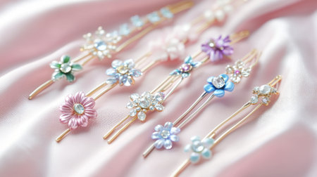 A stunning arrangement of floral hair pins displayed on soft satin fabric. Perfect for adding elegance to any hairstyle or special occasion.