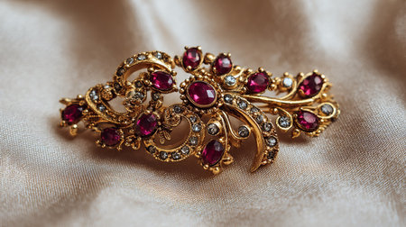 Captivating vintage hair accessories adorned with colorful gemstones, resting on a rich fabric background, embodying elegance and timeless beauty.