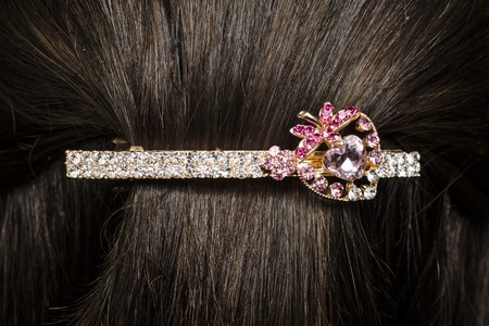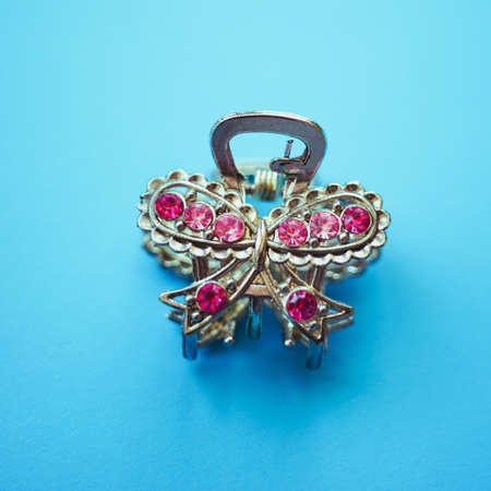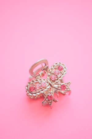Luxury hair clip on pink fabric with copyspace.