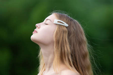 Profile of a beautiful girl with long hair on a summer background.