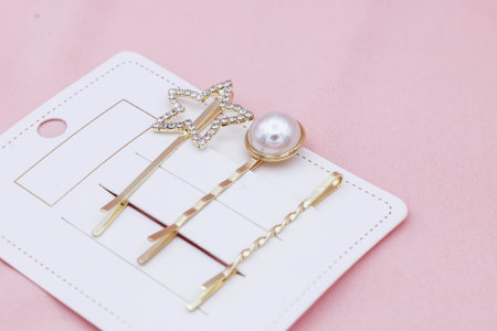 Luxury hair clips on pink fabric with copyspace.