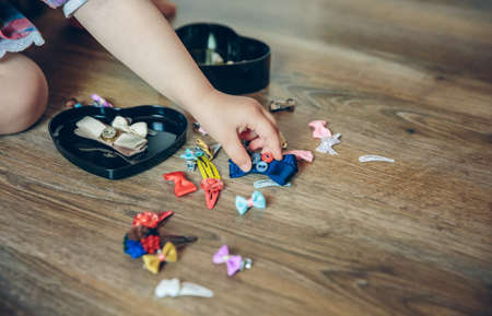 Closeup of baby girl hand playing with hair clips over a wooden floor at home. Selective focus on hand.