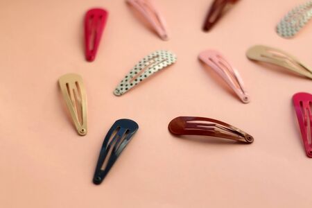 Pastel color metal hair clips on white background