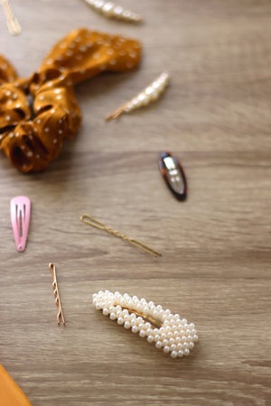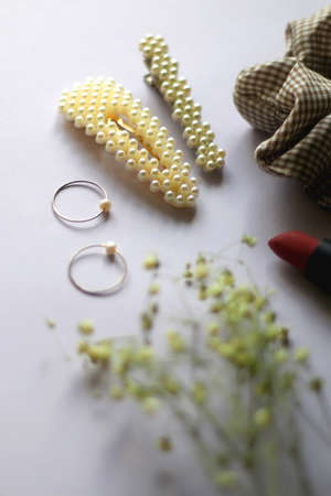 pearl jewelry earrings and hairpins on beige background