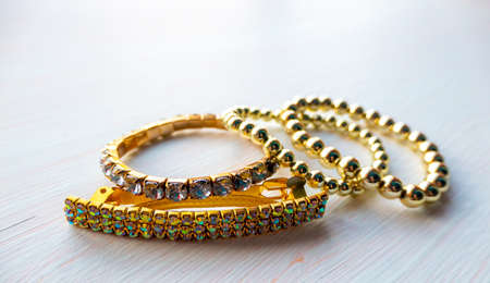 a lot of gold costume jewelry with different materials on a white background. High quality photo