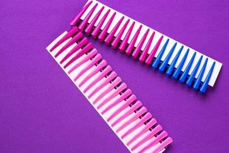 on a purple background hair clips of different colors in sets on a cardboard frame cool