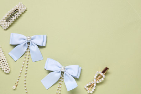 Cute hair accessories on color background, flat lay. Space for text