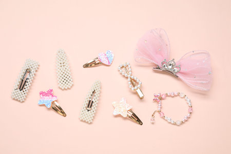 Different hair clips and bracelet on beige background, flat lay
