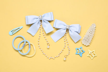 Different hair accessories on yellow background, flat lay