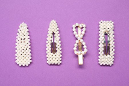 Different hair clips on purple background, flat lay