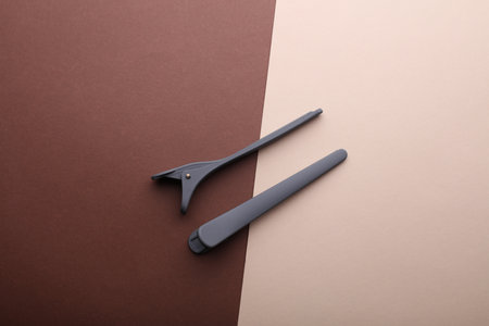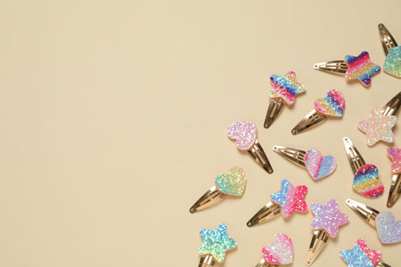 Beautiful hair clips on beige background, flat lay. Space for text