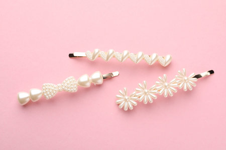 Set of pearl hairpins and elastic bands on pink background . High quality photo