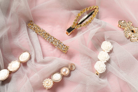 Beautiful hair clips on tulle fabric, flat lay