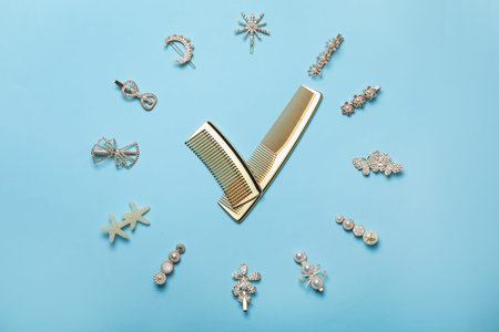 Clock shape made of combs and hair clips on light blue background, flat lay