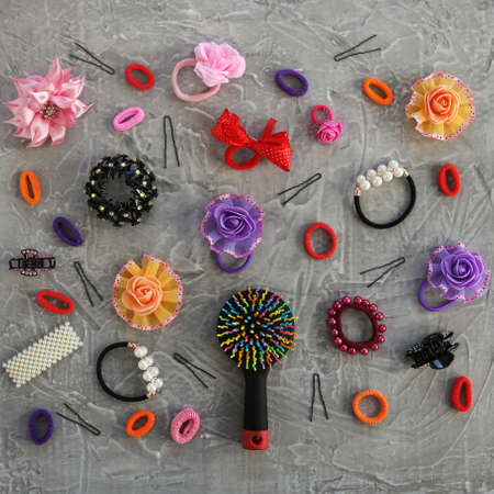 Different hair clips on gray background. flat lay. top view.