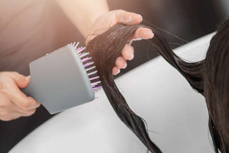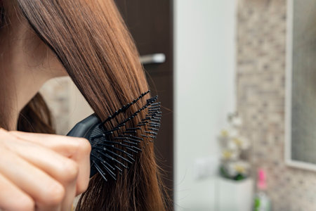 The girl combs her hair with a comb in the bathroom. Place for your text. Home hair care concept