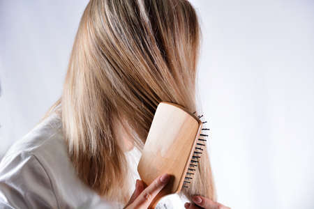 Young woman with wooden comb brushing her blonde hair isolated in studio white background. Cares about healthy and clean hair. Beauty salon concept. Close up, selective focus
