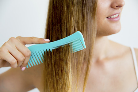 Combing and brushing concept. Routine everyday hygiene. Close up of detail blue comb in blonde smoothy healthy female hair.