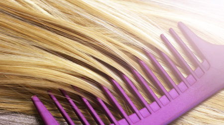 Haircare concept. Purple comb and blonde hair. Sunlight toned.