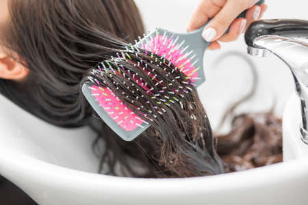 Shampooing hair in spa beauty salon of young brunette woman, hairdresser caring for client