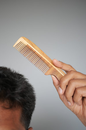 Young man styling his hair with a wooden comb. Hair styling at home. Advertising concept of shampoo for healthy hair and against dandruff.
