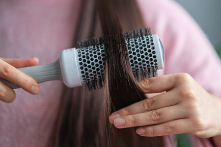 Woman trying to brush dry tangled hair ends. Healthy haircare and hairstyling concept.