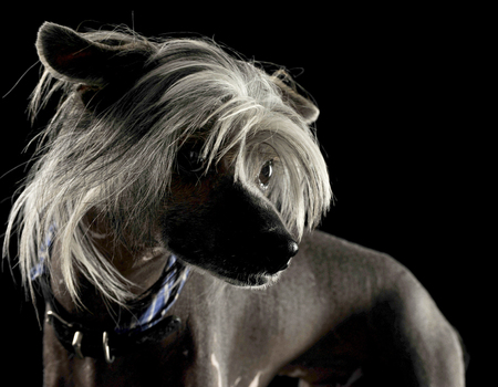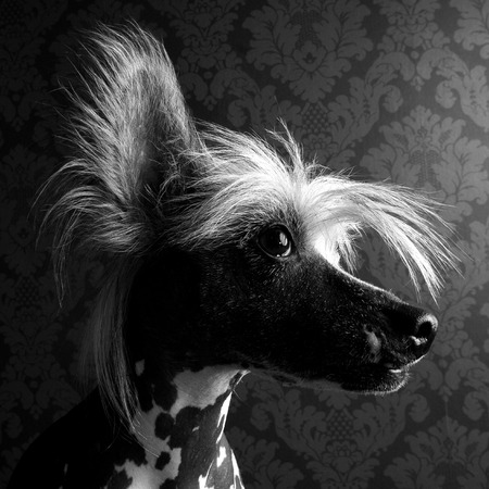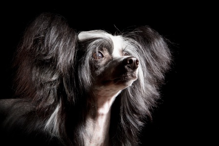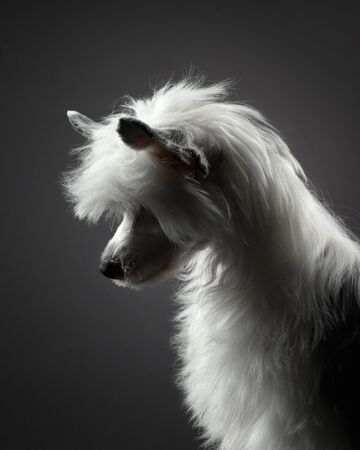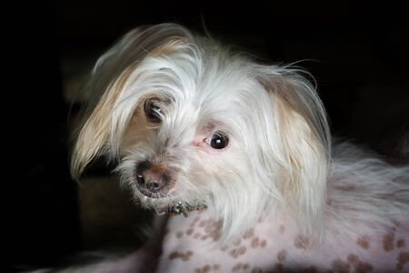 portrait of a Chinese crested dog on a dark background. nice Pet in the studio. Beautiful light