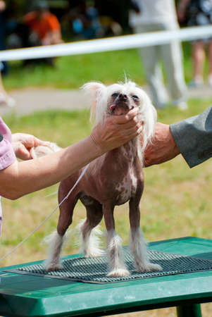 Badajoz, Spain - May 8, 2016: 32 International Exhibition Ed. of dogs. Chinese crested dog under the care of its owner before the exhibition contest