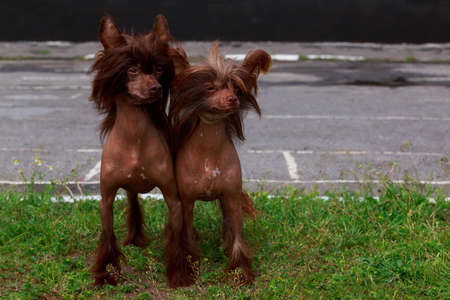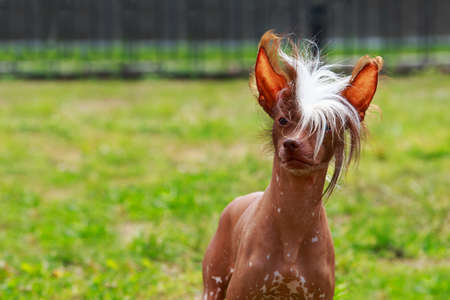 Cute hairless chinese crested dog is standing on a green meadow. Pet animals. Purebred dog.