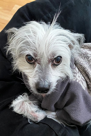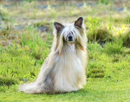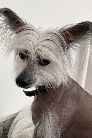 Groomed Chinese Crested Dog sitting - Powderpuff, 10 month old.