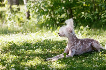 Chinese crested dog on green grass, summer spring season pet relax outddoor, copy space