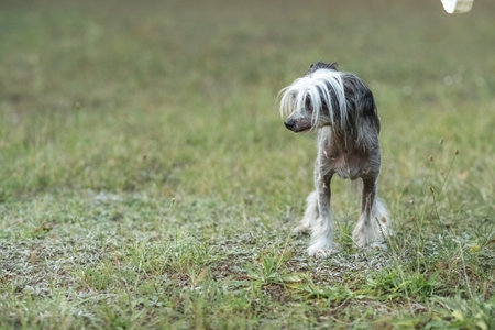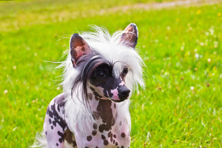 Cute powderpuff chinese crested dog is standing on a green meadow. Pet animals. Purebred dog.