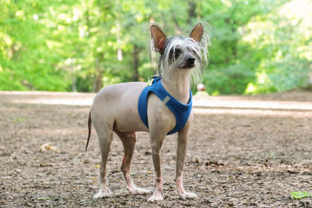 Chinese Crested dog in a chest harness sits on a path in the forest. White pedigreed dog with long hair on paws, muzzle and ears. Walk of the owner and dog in the park.