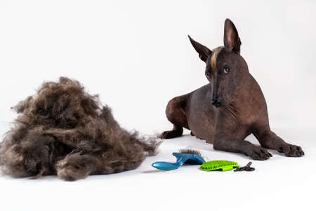 Beautiful hairless dog of Xoloitzcuintle breed with ginger mohawk lying down close to big pile of fur and groomer equipment, scissors, hair brushes. Humoristic concept of animal or human hair care.