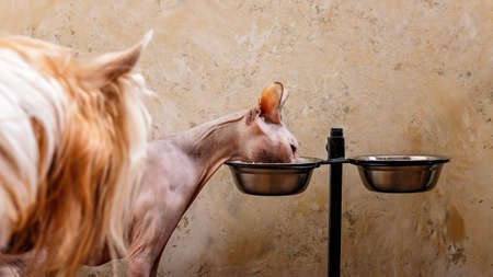 Banner format. A hairless dog watching the sphynx eating food from his bowl. Animal feeding, pets, hobbies. Close-up.