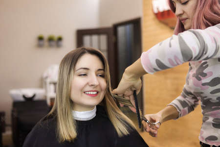 Hair care, hairdresser cuts the cut ends of hair and straightens the length, the work of hairdressers during the global pandemic.new