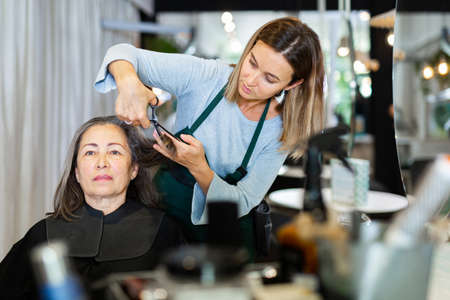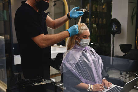 Professional stylist working with client in beauty salon. Hairdressing services during quarantine