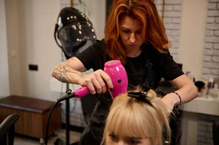 Close-up. Middle-aged red-haired female hairdresser with tattooed arms in a strict black uniform combing, straightening and drying the blonde hair of a client of a beauty salon using a pink hairdryer