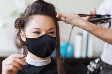 Hairdresser, protected by a mask, combing her clients hair with a hair iron in a salon.