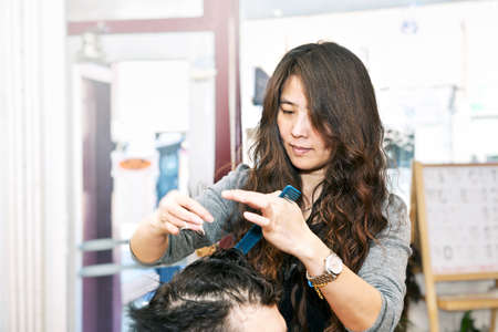 Asian male customer getting hair cut with hairdresser in salon. Fashionable barber using a scissor to trim client hair in barbershop