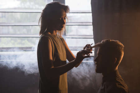 Female hairdresser cutting modern hipster hair. Hairdressing salon in dark place, stylish young male in focus on foreground, spooky atmosphere with white smoke