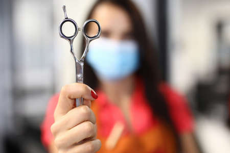 Woman in protective mask hold scissors in hand closeup. Professional work of master with hair. Haircut and hair styling in beauty salon. Training and getting hairdresser profession concept.