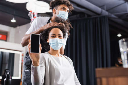 Smartphone with blank screen in hand of african american woman in medical mask near hairdresser on blurred background