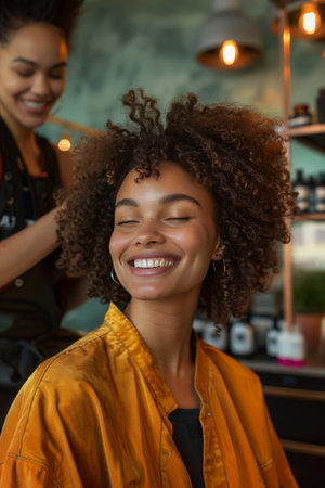 In a vibrant salon, a joyful hairdresser styles a smiling woman's voluminous afro hair, both exuding satisfaction and happiness in a modern beauty care setting.